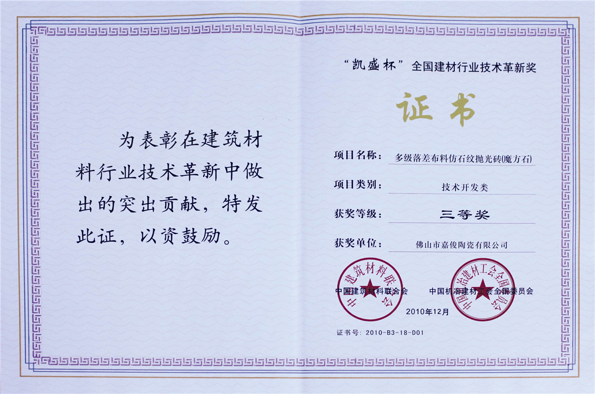 “凱盛杯”全國建材行業(yè)技術(shù)革新獎(jiǎng)三等獎(jiǎng)